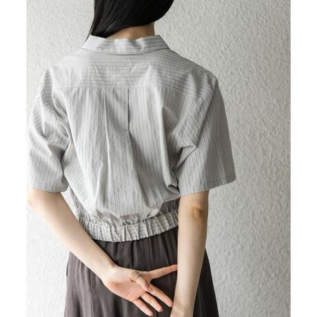モード感のあるスタイルにしてくれるストライプシャツ。後ろの裾をゴム仕様にすることで、ウエスト部分がきゅっと締まって見え、ショート丈なサイズはスタイルアップを叶えます。二の腕をカバーしてくれるデザインも嬉しいポイントです。