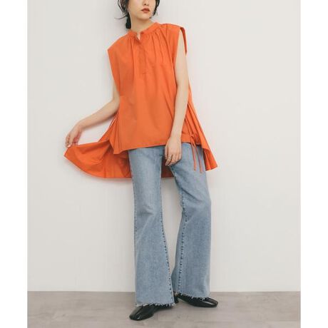 シンプルに見えながらも前後差のある着丈や、さりげないこだわりが詰まったブラウス。少しハリのある素材を使用しており、裾はハンカチーフヘムデザインにすることでボリューム感を出しました。サイドは紐が設定されており、結ぶとボリューム感を抑えつつシルエットの変化を楽しめます。夏のお洒落にぴったりな涼しげな1着です。