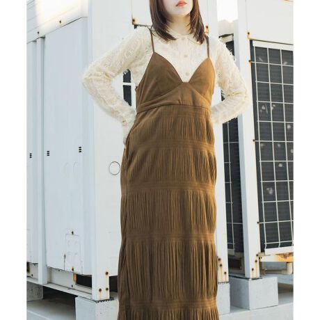 表情豊かなマジョリカプリーツと、シーズンムードを盛り上げるベロアを掛け合わせたIラインワンピース。キャミデザインなのでインナーを合わせるだけでなく、オーバーサイズのニットを重ねるとスカートのようにも使用いただけます。胸元のビスチェディテールや、スタイルアップが叶うシルエットにも注目。フェミニンコーデにおすすめです。