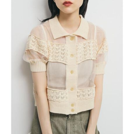 ボディの生地にオーガンジー素材を使用し、ボーダーの上にニットをドッキングさせたデザインが特徴的なトップス。カジュアルコーデにもマッチしやすいよう、襟や前立て、袖口はリブ仕様にしました。程よくコンパクトな着丈はハイウエストボトムと相性が良く、デニムのみならずスラックス合わせもぴったり。前の釦を開け、ジャケットのように羽織る着こなしもおすすめです。