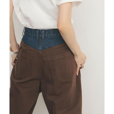 バイカラーデザインが特徴的で、異なる素材を使用した変化球パンツ。コクーンシルエットになっており、ウエストから深く取ったタックが膝下から広がります。程よくルーズなサイジングなので、腰回りをカバーしつつスタイルアップも叶う1着です。