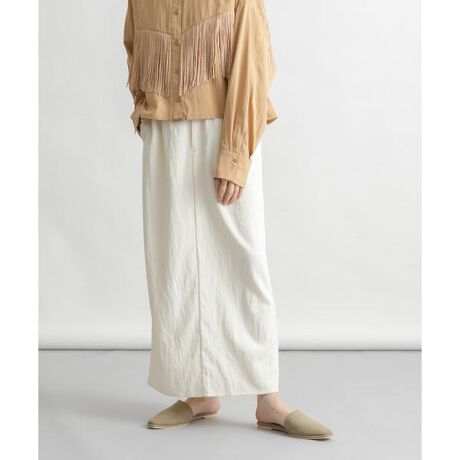 穿いていただくと綺麗なシルエットが叶うIラインスカート。着脱が楽な後ろゴム仕様で、ウエストの小さなダブルボタンがさりげないです。足捌きの良いスリットもポイント。タックイン・アウトどちらもサマになる1着です。