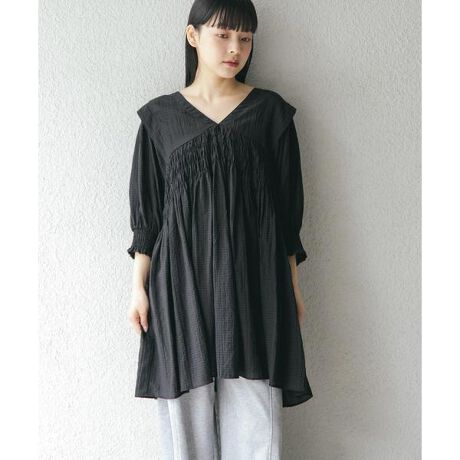 胸元のシャーリングが特徴的なミニワンピース。肩にタックを入れることできっちり感も出しつつ、程良くゆったりとしたサイジングは体型カバーを叶えます。柔らかめでボリュームがあり、表面感のあるシアー素材を使用したことで夏まで大活躍な1着に仕上げました。