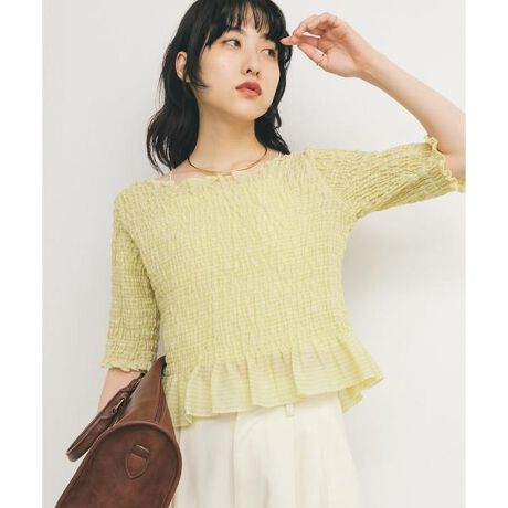 【フェミニンさと華やかさを兼ね備えたシャーリングブラウス】