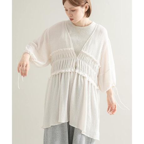 ポコポコとした表面感のある素材が特徴的なチュニック。胸元のシャーリングはスタイルアップして見え、ダブルリボンデザインがアクセントになっています。また、裾に向かってフレアになっており、腰回りもしっかりとカバーしてくれます。フェミニンスタイルはもちろん、Tシャツやデニムを合わせたカジュアルコーデにもマッチします。