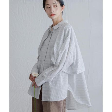 レイヤードデザインが存在感を引き上げてくれるチェック柄シャツ。二の腕や腰回りをカバーしてくれるサイズ感や、さらっと着ていただけるサッカー素材がポイント。タックイン・アウトどちらも可能で、ベーシックアイテムに合わせるだけで主役級コーデが叶います。