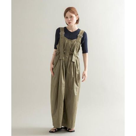 光沢感のある素材がアクセントになったジャンパースカート。程良くゆったりとしたサイジングと、足捌きもしやすいバックスリット仕様もポイントです。ウエストと肩紐は調整可能なため、簡単にシルエットチェンジが可能です。合わせるインナー次第ではロングスパンの活躍が期待できます。