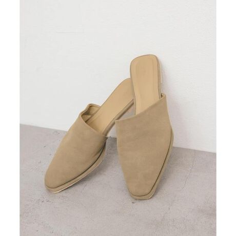 スエードライクな生地を使用したフラットシューズ。シンプルな印象ですが、履き口のカットはアシンメトリー仕様になっています。トゥに向かって細くすっきりとした印象なので、シティ感のあるコーデが叶います。