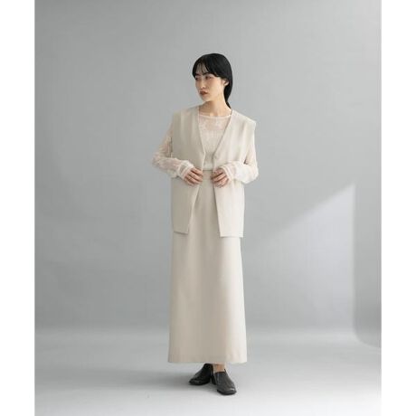 肩回りの華奢見えが叶うボックスシルエットのベストと、タイトストレートのスカートがセットになった着回し力の高い1着。ベストは、Vネック開きや前後に入ったベンツスリットが抜け感をプラスしており、スカートは足捌きが良いバックスリット仕様となっております。それぞれ単品でも着用可能な汎用性のあるアイテムです。