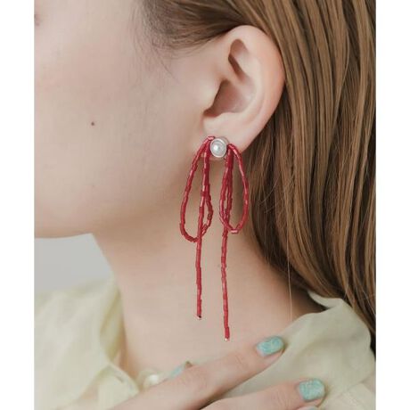 落ち着いたボルドーの赤色ビーズが、キュートなリボンシルエットながら大人っぽさのある耳元を演出してくれるイヤリング。