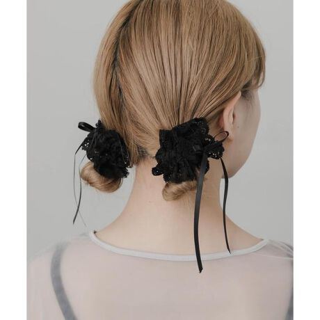 レースとリボンを兼ね合わせた王道のガーリーコンビをシュシュに落とし込みました。