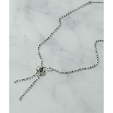 ローズ×リボンのトップがキュートな印象ながら、ボールチェーンで甘さを抑えたショートネックレス。