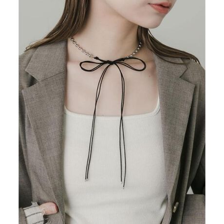 シルバーのボールチェーンと、ブラックのコードを組み合わせたネックレス。異素材の組み合わせが都会的な雰囲気で、コーディネートに取り入れることでぐっと引き締まった印象に。