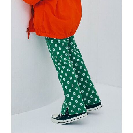 コーディネートのポイントになる花柄とロゴボーダー柄。