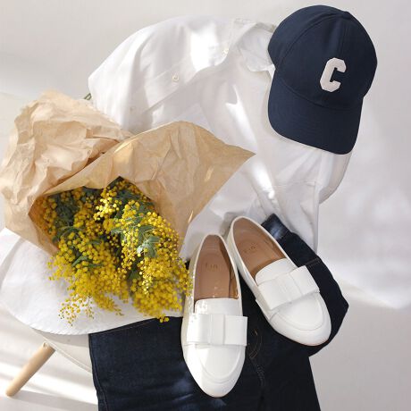 存在感のあるリボンが今っぽいFin(フィン)のリボンローファーが登場しました。すらっと伸びるフォルムは程よくシェイプされていて足元をすらっと魅せる優秀デザイン。アッパーのリボンは大き目ですが共素材で大人も履ける上品な雰囲気に。