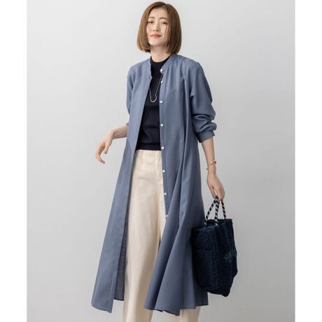 比翼仕立ての前開きレギュラーカラーの長袖シャツワンピース。縦のラインで切り替えることですっきりとした印象ながら、裾にかけてマチを入れ分量感をもたせることで、さりげなく華やかさのあるフレアシルエットに仕立てています。フロントボタンを開けて羽織としても着回しを楽しめる1着です。爽やかな印象のスモーキーブルー(#074)、品の良さを引き立てるネイビー(#075)の2色展開です。