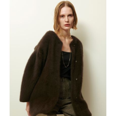 トレサビリティの環境下で飼育されたフォックスの梳き毛だけをカシミヤにブレンドした編地に密に編んだポリエステル編地を裏打ちしてしっかりと膨らみを持たせたコーディガンです。
