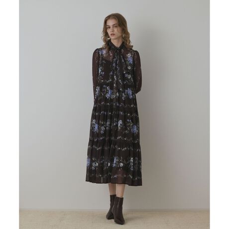 緻密に計算された柄のレイアウトが美しく、着た時に上品に着映えるデザインです。軽くて程よい透け感のあるシフォン素材にクラシカルな柄や落ち着いたシックなカラーパレットが美しく調和した一枚。体から離れるゆったりとした優しいシルエットに、たっぷり用尺をとりティアードで表現した贅沢な蹴回しで、歩いた時の綺麗な揺れ感を表現しました。首元に添えたボウタイは、ウエストに巻いてフィット&フレアシルエットとして着る事も可能。袖口にはシャーリングテクニックを施し、たくし上げればまだ暑い時期からご着用いただけます。甘さ控えめに仕上げた大人のフラワーワンピースを、この機会にぜひ。
