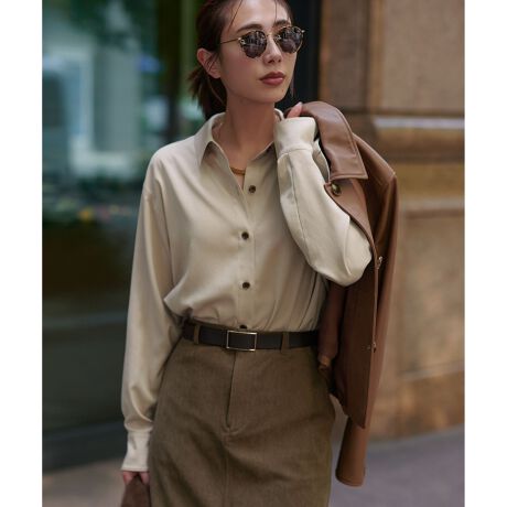 素材感を生かした、こなれた雰囲気を演出してくれるシンプルなシャツです。落ち感のある素材を緩めのシルエットにすることで、女性らしい着こなしを楽しんでいただけます。1枚でサラリと着こなせば上品な印象に、羽織りとしてレイヤードスタイルを楽しめば、こなれた抜け感をプラス。肌寒い季節にはインナーとしても活躍し、幅広い着こなしでシーズンムードを盛り上げます。少し大きめのボタンにすることで、アクセントをプラスしています。カラーは、スエードらしさが演出できるキャメル(#034)、アイボリー寄りの明るいベージュ(#033)、甘すぎないシックな雰囲気のカーキ(#054)の3色展開です。