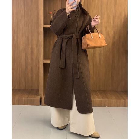 【BANICO】スタンドカラー ベルト付きウールロングコート