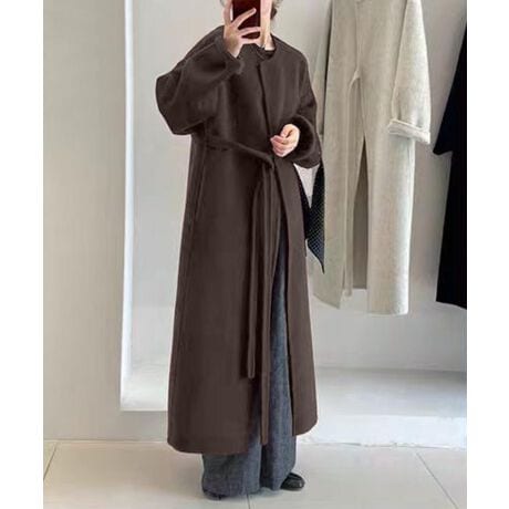 凛とした佇まいを引き立てる、ノーカラーデザインに共布リボンをあしらったロングコート。余計な装飾を省いたミニマルなラインの中に、ウエストのリボンが柔らかな女性らしさを添える一着です。