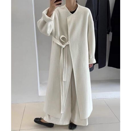 凛とした佇まいを引き立てる、ノーカラーデザインに共布リボンをあしらったロングコート。余計な装飾を省いたミニマルなラインの中に、ウエストのリボンが柔らかな女性らしさを添える一着です。