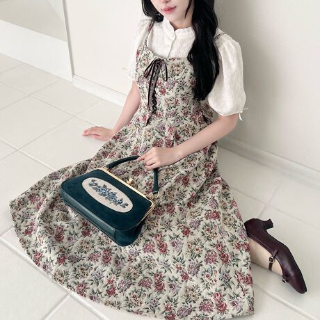 刺繍バッグなどのクラシカル小物を合わせてムードたっぷりにコーデを楽しんで。