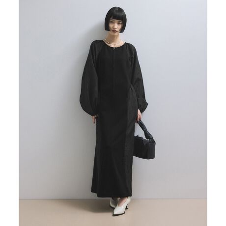 袖、スカート切り替え部分:光沢感のある生地を使用。シワ加工が入っており、表情感のある素材。