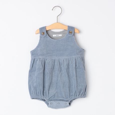 柔らかなコーデュロイを使用した、オーバーオール型のロンパース。