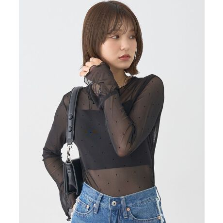 今年らしいレイヤードスタイルが決まるシアープルオーバー。立体感のあるフロッキードットにキャンディスリーブやフリルネックなどこだわりが詰まったフェミニンな一枚です。アウトラインにはメロー始末を施し、重ね着した時にちらりと覗くアクセント使いにもおすすめ。メイントップではもちろんインナーとしても活躍するおすすめのアイテムです。透け感[ややあり]