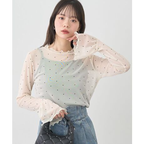 今年らしいレイヤードスタイルが決まるシアープルオーバー。立体感のあるフロッキードットにキャンディスリーブやフリルネックなどこだわりが詰まったフェミニンな一枚です。アウトラインにはメロー始末を施し、重ね着した時にちらりと覗くアクセント使いにもおすすめ。メイントップではもちろんインナーとしても活躍するおすすめのアイテムです。透け感[ややあり]