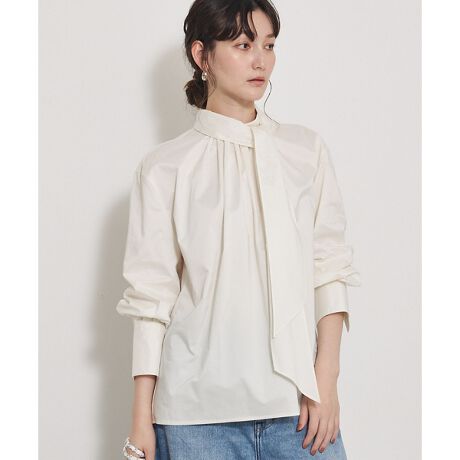 タックインしてボウタイを結べば、女性らしいクラシカルな印象に。