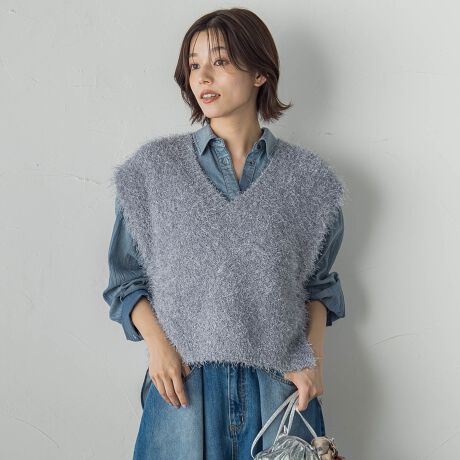 ニュアンスカラーのフェザーにラメミックスの表情が華やかさをプラスしてくれる今年らしいニットベスト。