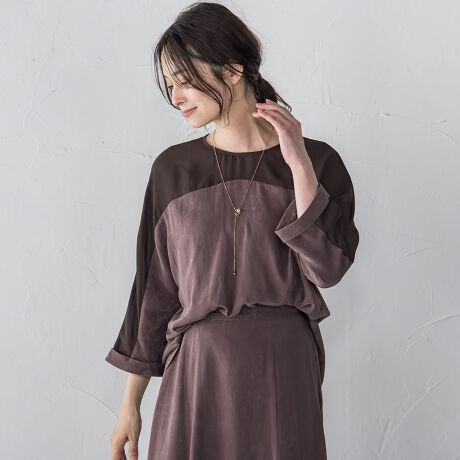 柔らかなスエード調サテンに、繊細なシアー切り替えを組み合わせた上品なブラウス。