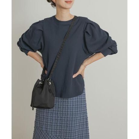 ボディはシンプルなデザインですが、袖山に大きなタックを入れることで立体感が生まれ一枚で華やさを演出します。