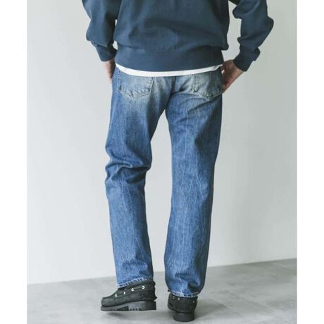 ビンテージのデニムベースに股上を少し深く調整し、裾にかけてゆるやかにテーパードがかかるトレンド感のあるシルエットにアップデート。