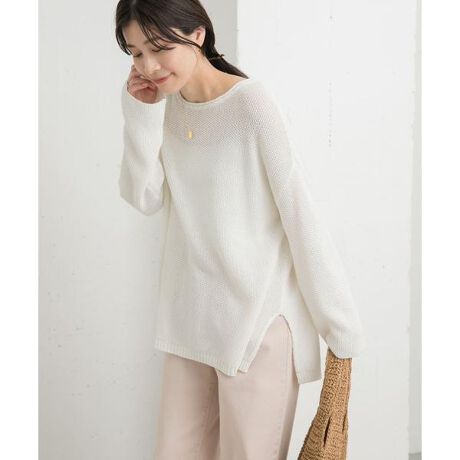 ボートネックのロール衿にすることでさり気ない表情を付けつつ、袖はゆったりと長めに設定しルーズなイメージに。