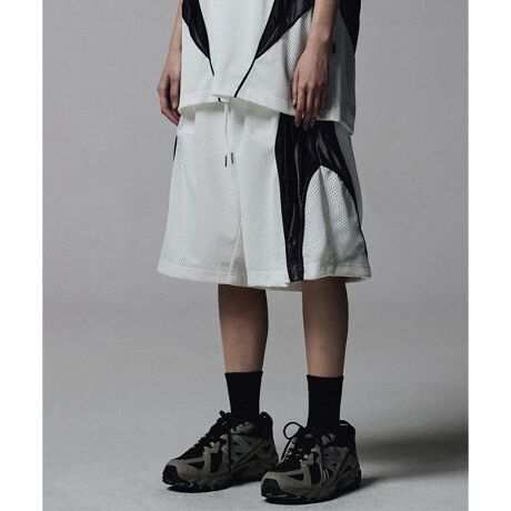 異素材の切り替えやブランドのシンボルである4マークロゴ刺繍が目を惹くメッシュショーツ。