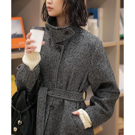 毎年好評のFREE'S MARTオリジナル生地を使用したコート。無地ブラックのほかに、今年はツイード(#011ブラックベース、#051ブラウンベース)を揃えています。ジャージ素材をフェルト化して織り上げ、嵩のある肉感と打ち込みが強いのが特徴。また毛羽立ちが少なく、保温性に優れています。襟はスタンドカラーに取り外し可能なタブが付いており、防寒としてはもちろん、デザインポイントとしても今季らしい1着。第1ボタンを外すとダブル襟になり、2wayで着用いただけます。ウエストベルトを締めると、ミニワンピースのようなシルエットに。ミニスカートやショートパンツとも合う着丈です。ミニスカートやショートパンツにロングブーツ合わせコーデがおススメですが、ロングスカートやマキシワンピースと合わせても大人っぽい表情に見せてくれます。※モデルの着用画像の場合、光の当たり具合により、実際の色味と異なって見えることがございます。色味は、商品単体の画像をご参照ください。