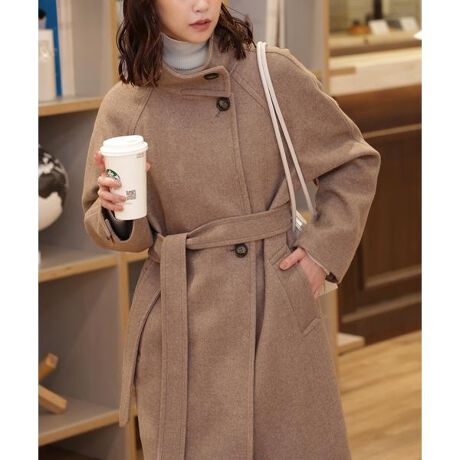 ジャージ素材をフェルト化して織り上げたオリジナル生地のロングコート。メルトンウール素材の見た目をジャージ素材で表現したコートは、防寒にも優れており、打ち込みの強い高級感のある生地を使用。形はスタンドカラーで襟腰が高く、(1)ボタンを全て閉じる、(2)襟腰のワンボタンと第二ボタンを外して襟を返す、(3)ボタンを全てオープンにするなど、様々な表情に変わります。インナーにニットを着込みやすいラグランスリーブとゆとりのあるバスト設定。付属でウエストベルトが付いているので、好みで絞ったり、ベルト無しでAラインも楽しめます。※こちらの商品はXSサイズの展開がございます。◆サイズ目安◆XSサイズ→身長150cm-152cm ウエスト57cm-59cm※モデルの着用画像の場合、光の当たり具合により、実際の色味と異なって見えることがございます。色味は、商品単体の画像をご参照ください。