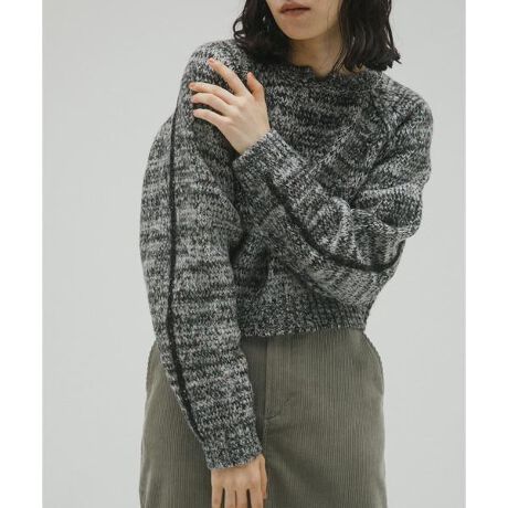 粗野感のあるドライなウール混のツィード糸を使用。2色を引き揃えてカラーをアレンジしました。袖にボリュームをもたせて程よいショート丈のデザインにしました。スリットの入った横広がりのクルーネックですので中にシャツを合わせても可愛く着こなせます。後ろ袖にポイントのラインが入っていますのでバックスタイルも可愛くなっています。