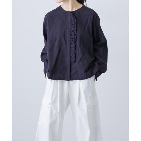 大人の装いに程よい華やぎを添えるトップスが届きました。風合い豊かな生地の質感とフリルが絶妙なバランスを生み、さり気ない甘さが表現されています。フリルは前立ての片方だけなので取り入れやすく袖口にもさり気なく配置。端は断ち切り始末にしてラフなムードをまとわせました。1枚で着映える優秀なアイテム。コットン高混率素材なので長く着まわしをお楽しみください。
