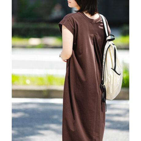 40/2のガス焼きコットン天竺の製品染めワンピースです。ガス焼きした素材を使用していますので製品染めでも毛羽立ちがなく滑らかな風合いに仕上がっています。ボックスシルエットのカジュアルすぎないデザインと肩が隠れるフレンチスリーブデザインなので、肌見せが抑えられ、二の腕の華奢見せ効果も期待でき、1枚で着やすいワンピースです。