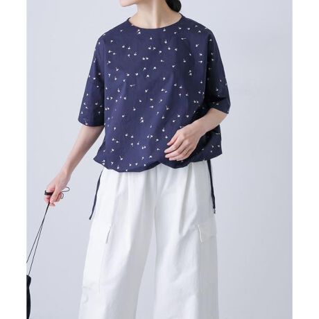 薄手の綿素材を使用したトップスをご紹介します。抜染プリントで仕上げた小花柄が大人の可愛げを表現。ベースがダークトーンなので総柄ながらも派手にはなりすぎず、程よい華やかさがポイント。ゆったりとしたワイドシルエットが涼しい着心地を叶えます。裾はドローコード仕様を採用しアクセントをプラス。そのままストレートに、絞ってブラウジングしたりとスタイリングに合わせて変化をお楽しみいただけます。