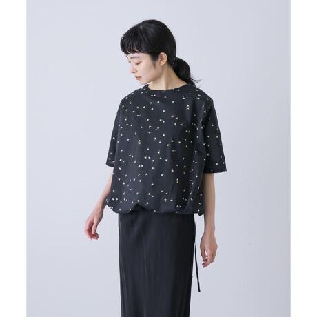 薄手の綿素材を使用したトップスをご紹介します。抜染プリントで仕上げた小花柄が大人の可愛げを表現。ベースがダークトーンなので総柄ながらも派手にはなりすぎず、程よい華やかさがポイント。ゆったりとしたワイドシルエットが涼しい着心地を叶えます。裾はドローコード仕様を採用しアクセントをプラス。そのままストレートに、絞ってブラウジングしたりとスタイリングに合わせて変化をお楽しみいただけます。