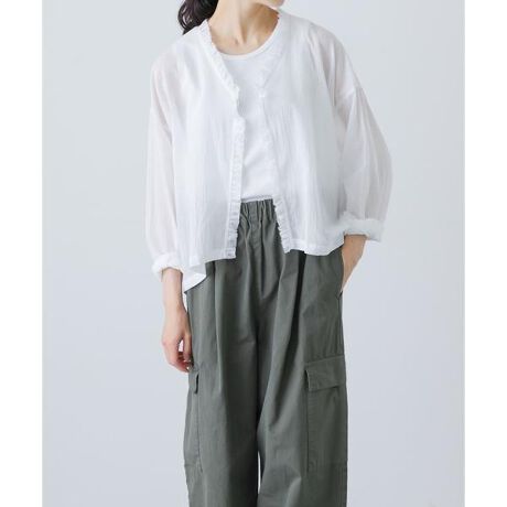 フロントにボタンがひとつ配置され、気軽に羽織ることができる仕様。前立てから襟にかけてぐるりとフリルがあしらわれたデザインです。さらっとしたコットン素材を使用し、上品な雰囲気がありつつ程よくラフなムードも纏っています。こなれ感を高めるナチュラルなシワにも注目。カジュアルなボトムやサロペットと合わせるスタイリングがおすすめです。