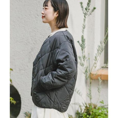 軽量で保温力にも優れた中綿を使用したノーカラーブルゾン。メンズライクになりがちなディテールを削ぎ落としたダイヤモンドキルティングデザインを今年も引き続き採用しました◎