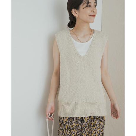 トレンド感のある深Vネックが魅力のニットベストは、レイヤードスタイルに抜け感をプラスしてくれるアイテム。