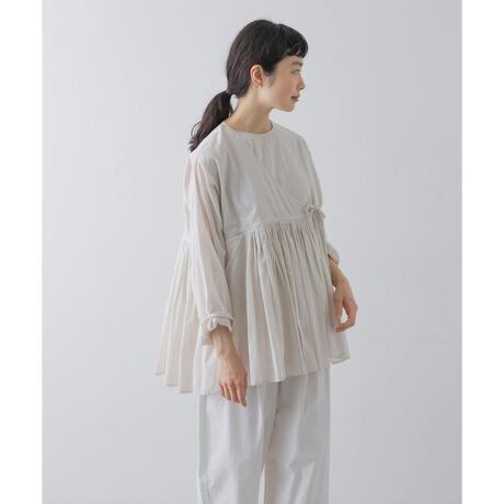 インドの伝統的なディテールを取り入れたこだわりのブラウス。フロントが重なるカシュクール仕様です。胸下から細かいタックギャザーが施され1枚で雰囲気のある装いに。民族感が強くなりすぎないよう着やすいデザインに再構築しました。前を閉めるとクルーネックに、ボタンを開けるとVネックのようにも着用可能。カジュアルなパンツやストレートシルエットのスカートを合わせてお楽しみください。羽織りとして使ったり、上からカーディガンを合わせたスタイリングも素敵ですよ。