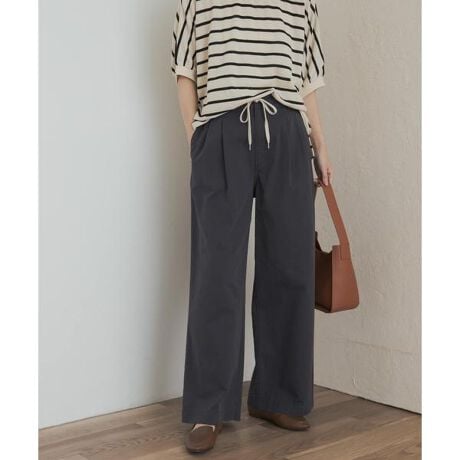 ワイドなシルエットながら、タック入りで腰回りはすっきりと見える設計に。